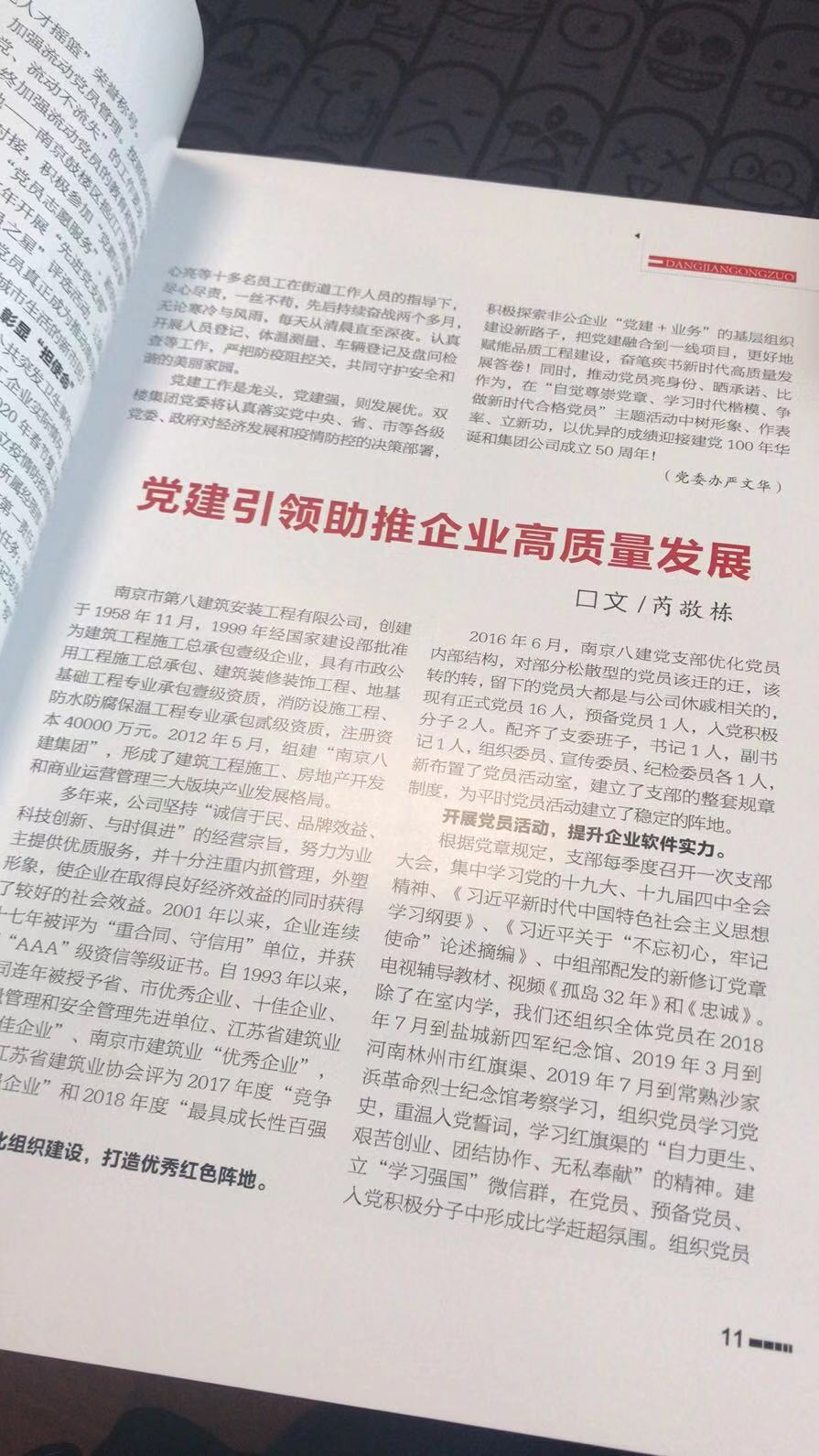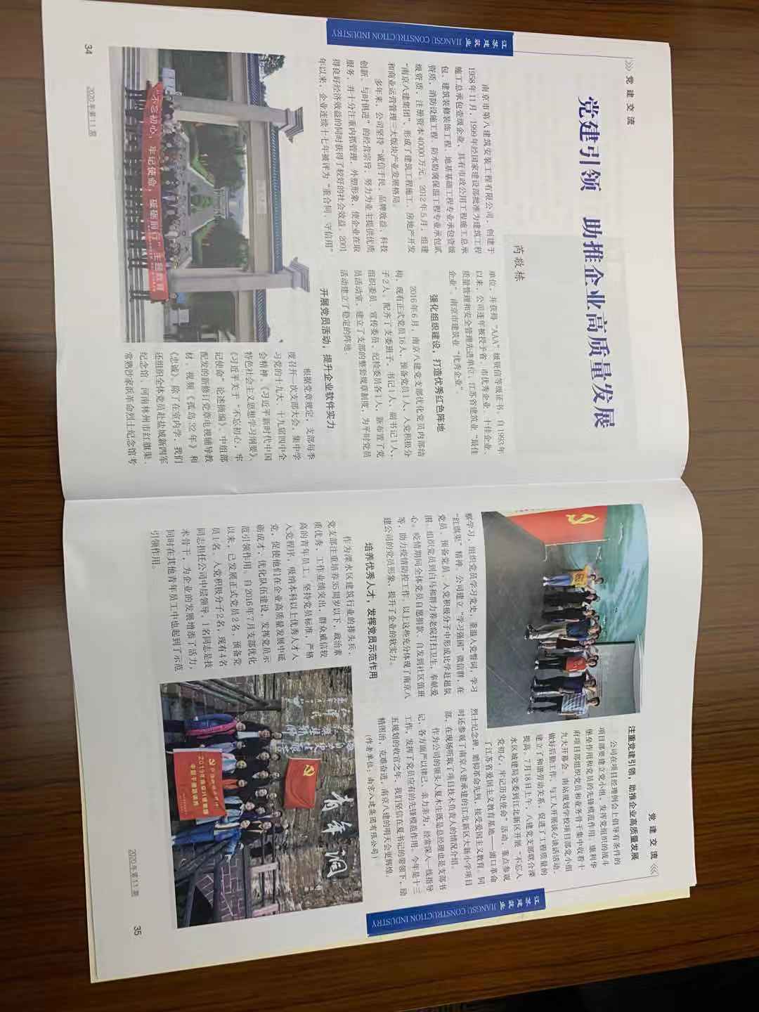 2024年9月,南京建筑業(yè)協(xié)會主辦的《南京建筑業(yè)》(第105期)刊登了芮敬棟同志《深化黨紀學習 筑牢紀律防線——南京八建黨支部黨紀教育活動紀實》一文 -